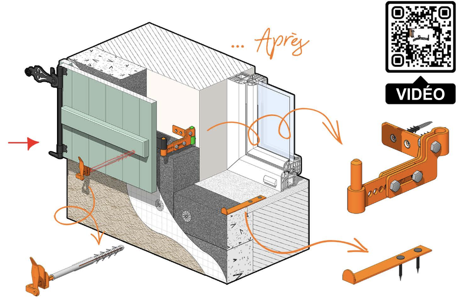Réglable : Les volets sont déportés à l’identique Pose rapide et simple : pas de soudure nécessaire Permet le réemploi des volets et des gonds existants sans la moindre modification